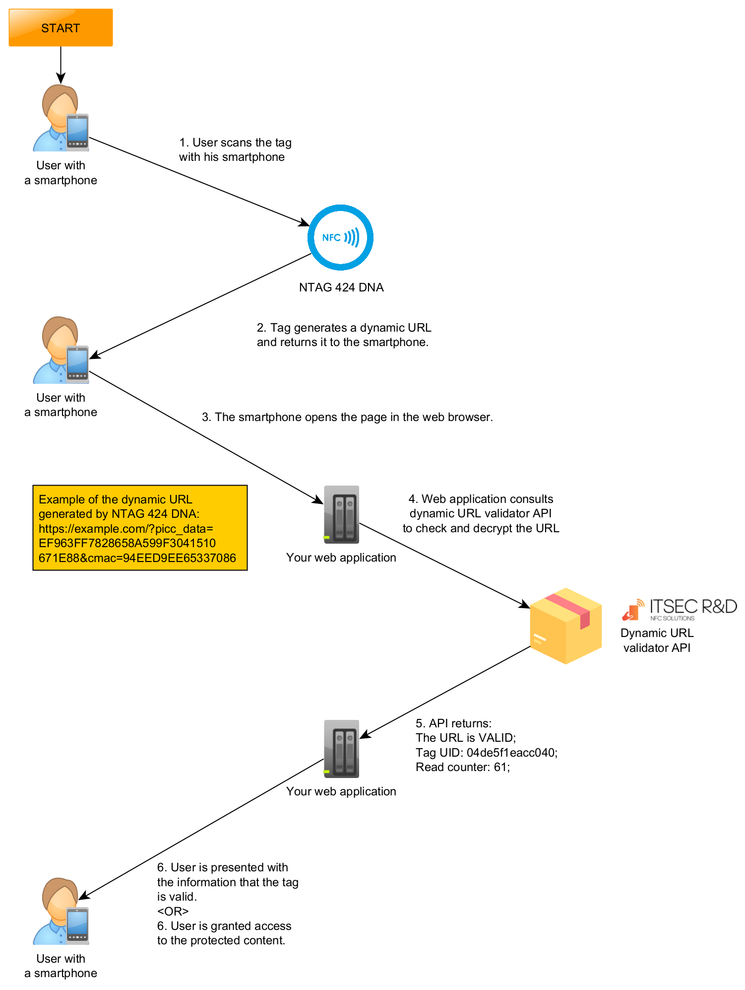 NFC technology is extremely powerful, although it’s still not widely deployed in any area except simple access control and credit card payments. NTAG® 424 DNA tag is a game-changer, because it’s both cheap and intentionally designed for integration with web applications. Here is how the overall process of integration should look like.