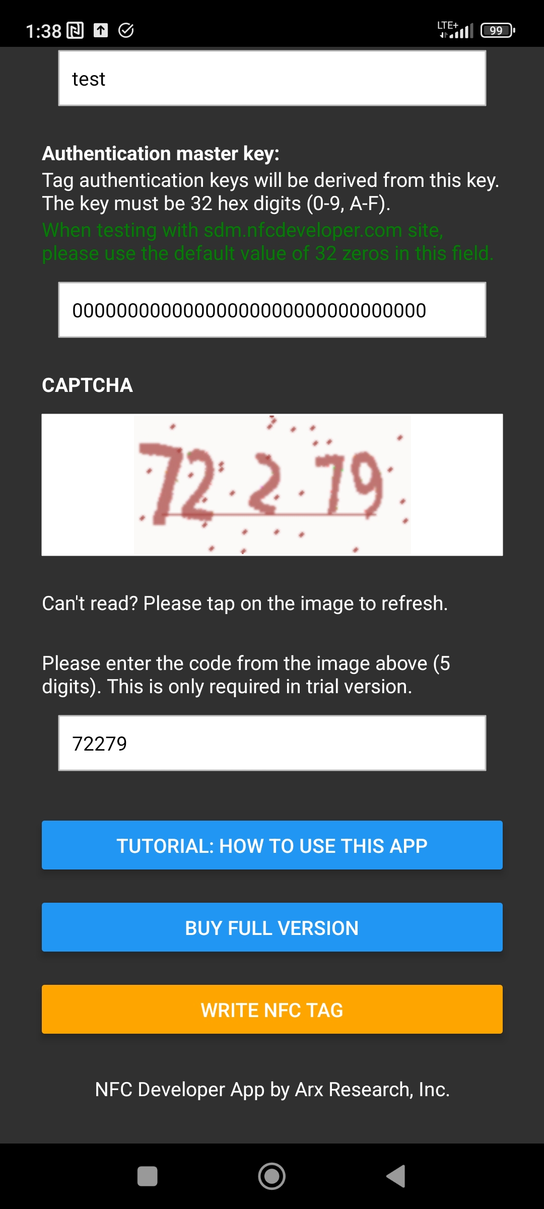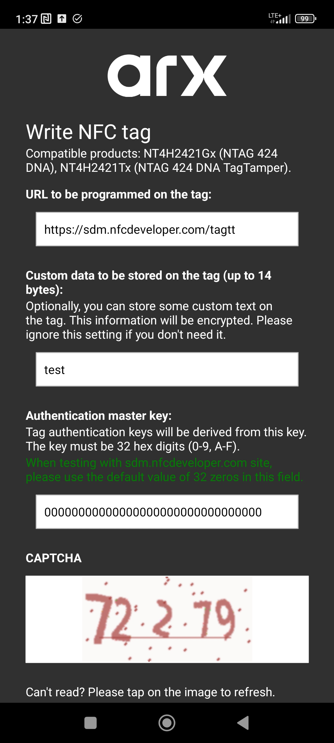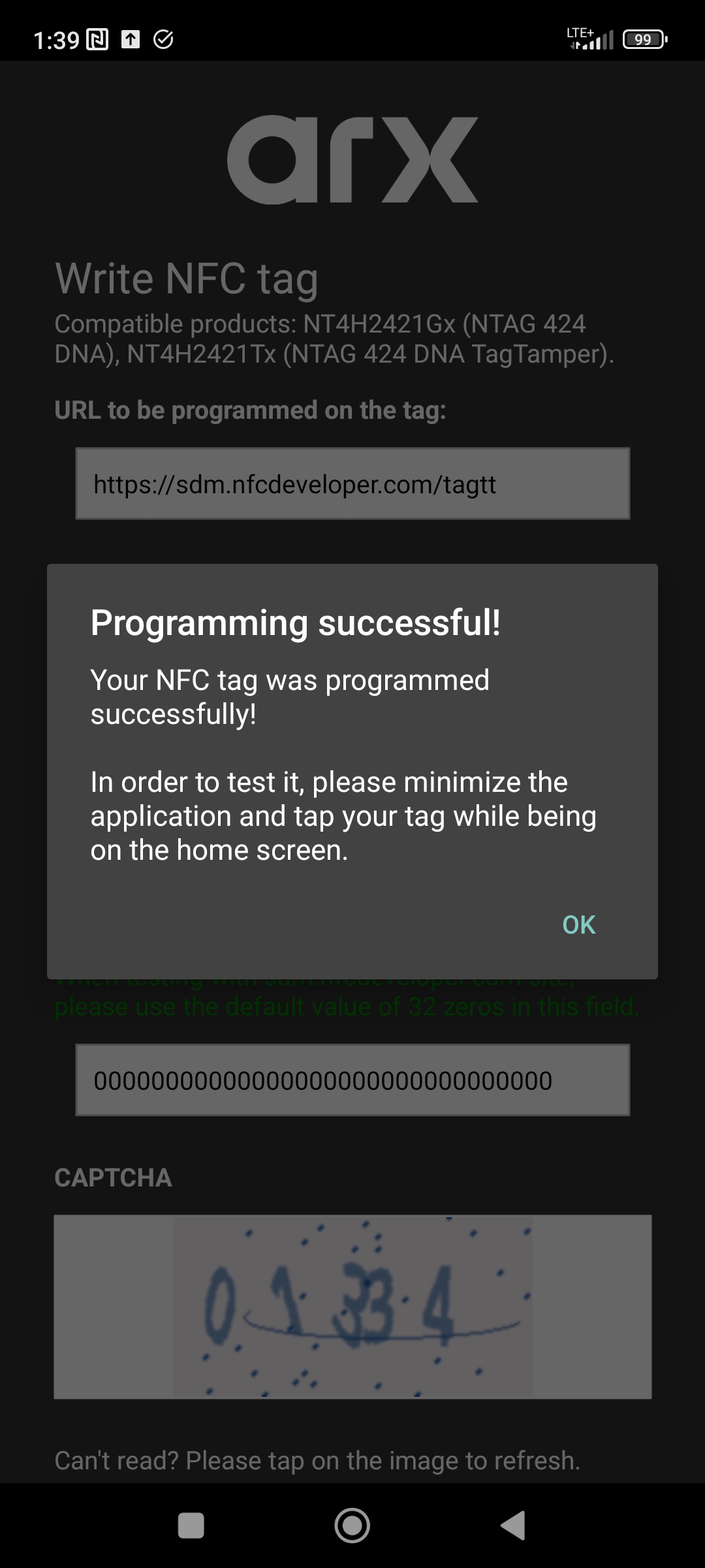 Finally, please fill out the CAPTCHA field and click "Write NFC tag" button. After programming, the NFC tag will be secured and programmed. The tag will point to your own instance of SDM backend.