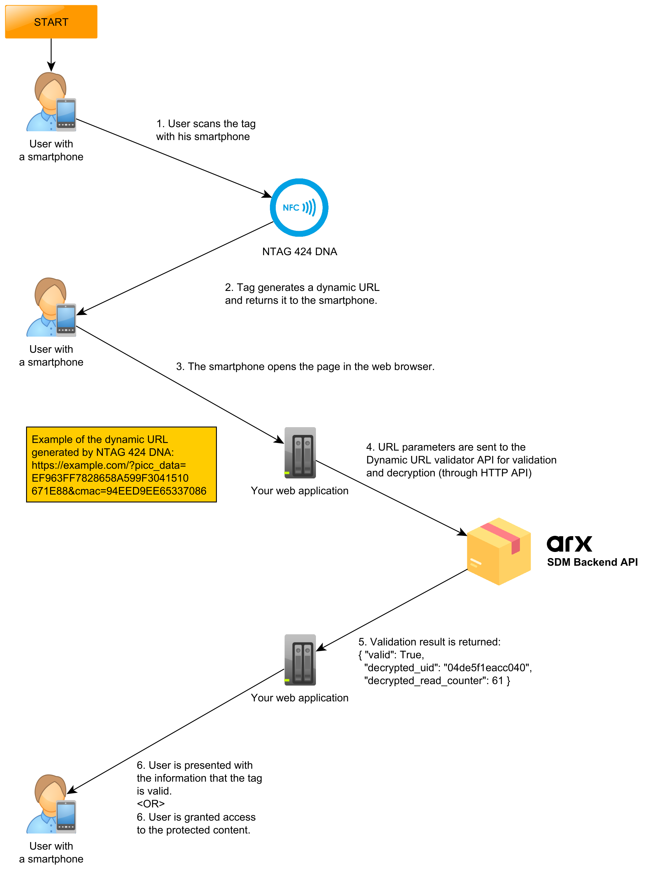 If you want to use NFC tags in production, you would rather want to point the NFC tags directly to your own web application instead of the SDM backend.